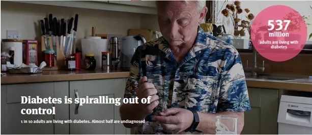 据国际糖尿病联盟(IDF)最新发布的数据,2021年全球约有5.37亿成年人(20-79岁)患有糖尿病,约占成年人群的十分之一,其中中国糖尿病患者人数达1.4亿。排除与COVID-19相关的死亡事件,估计2021年约有670万成年人死于糖尿病或其并发症,每5秒钟就有1人因糖尿病死亡,占全球全因死亡人数的十分之一(12.2%)以上。?